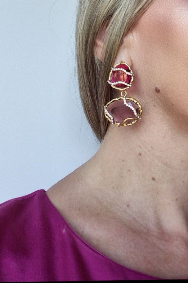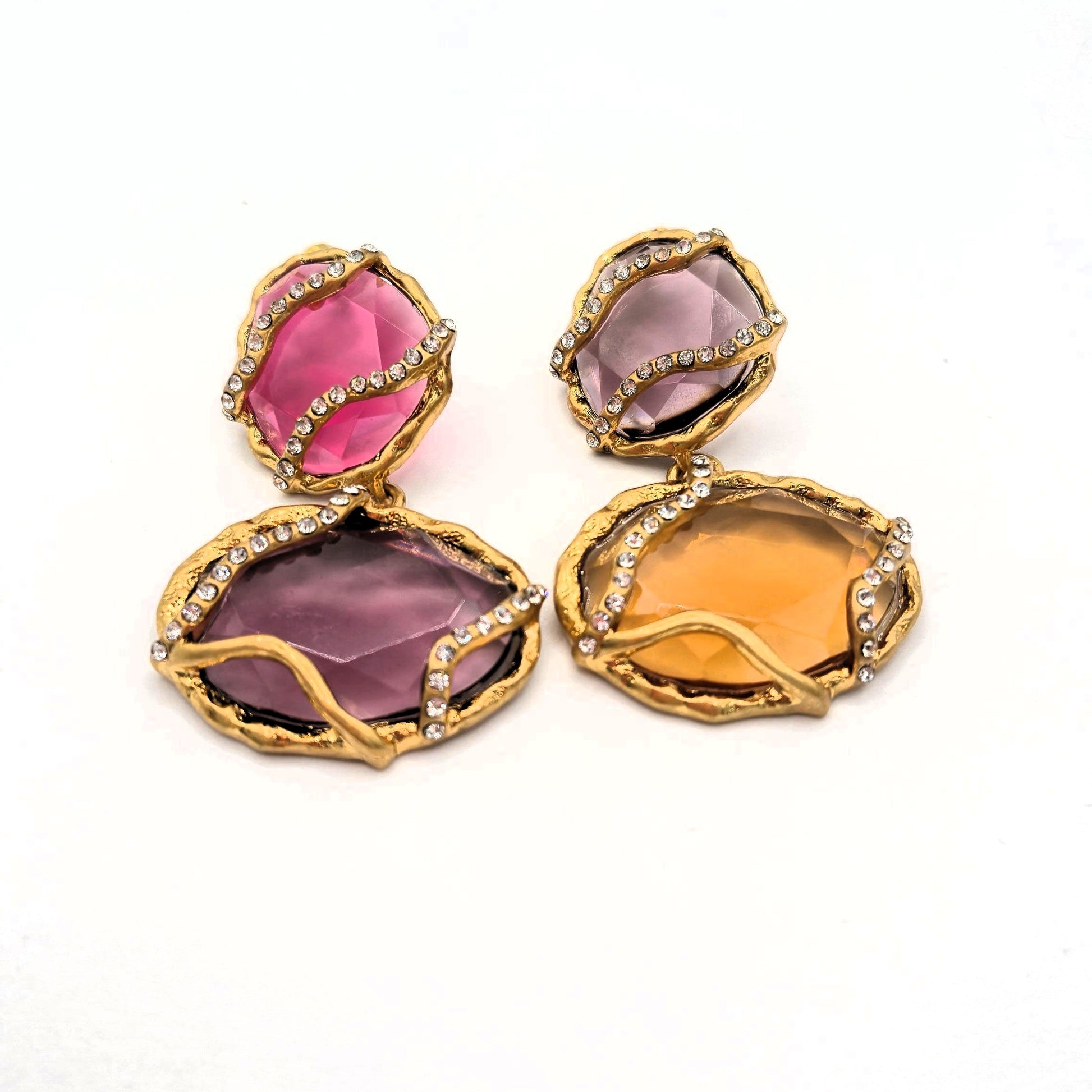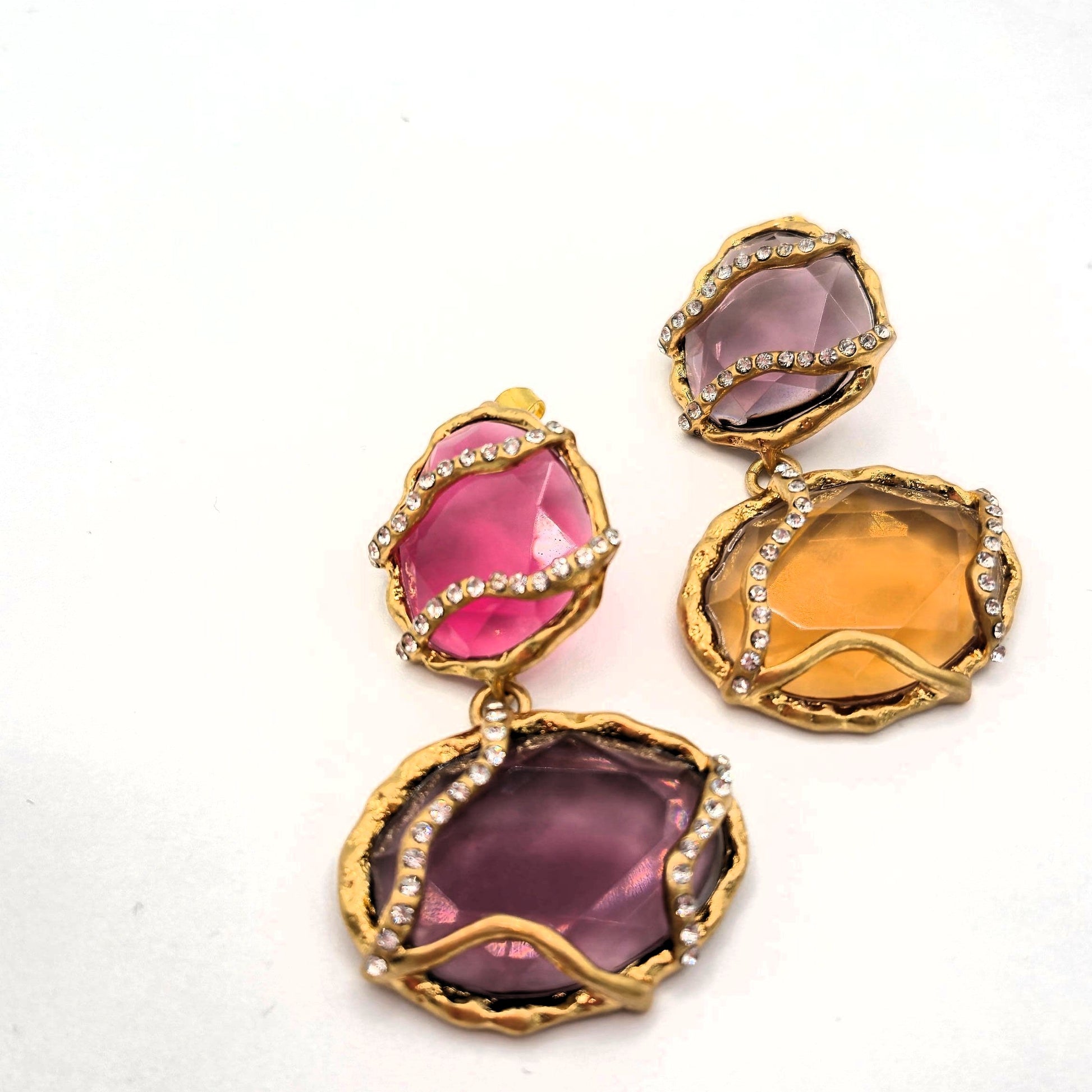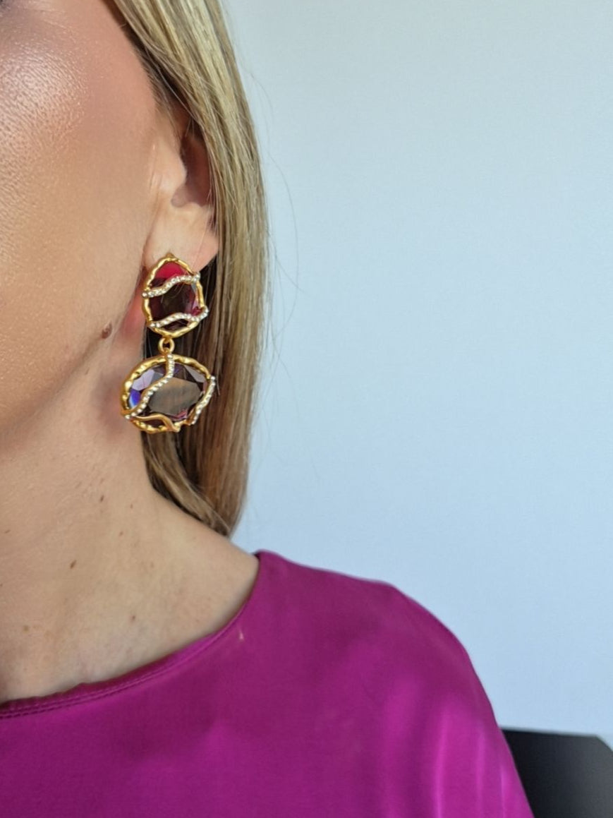 Pendientes Alboroto Andaluz Medianos con cristales irregulares multicolor y borde dorado texturizado. Una versión más ligera del modelo original, igual de expresiva igual de única.