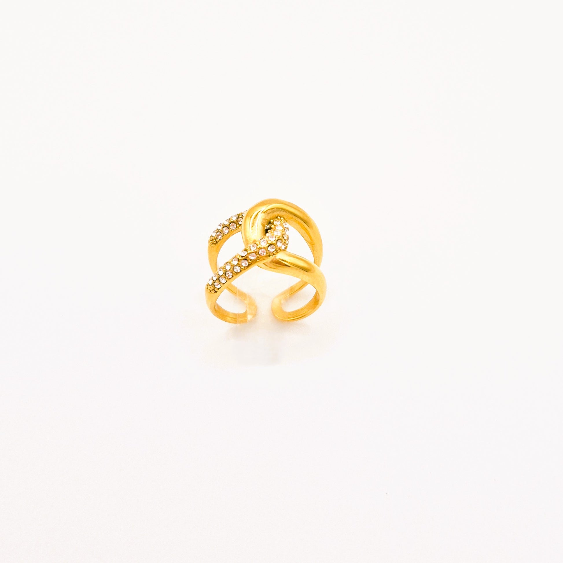 Anillo ajustable de acero inoxidable con baño de oro, con doble aro entrelazado y circonitas que brillan en cada movimiento.