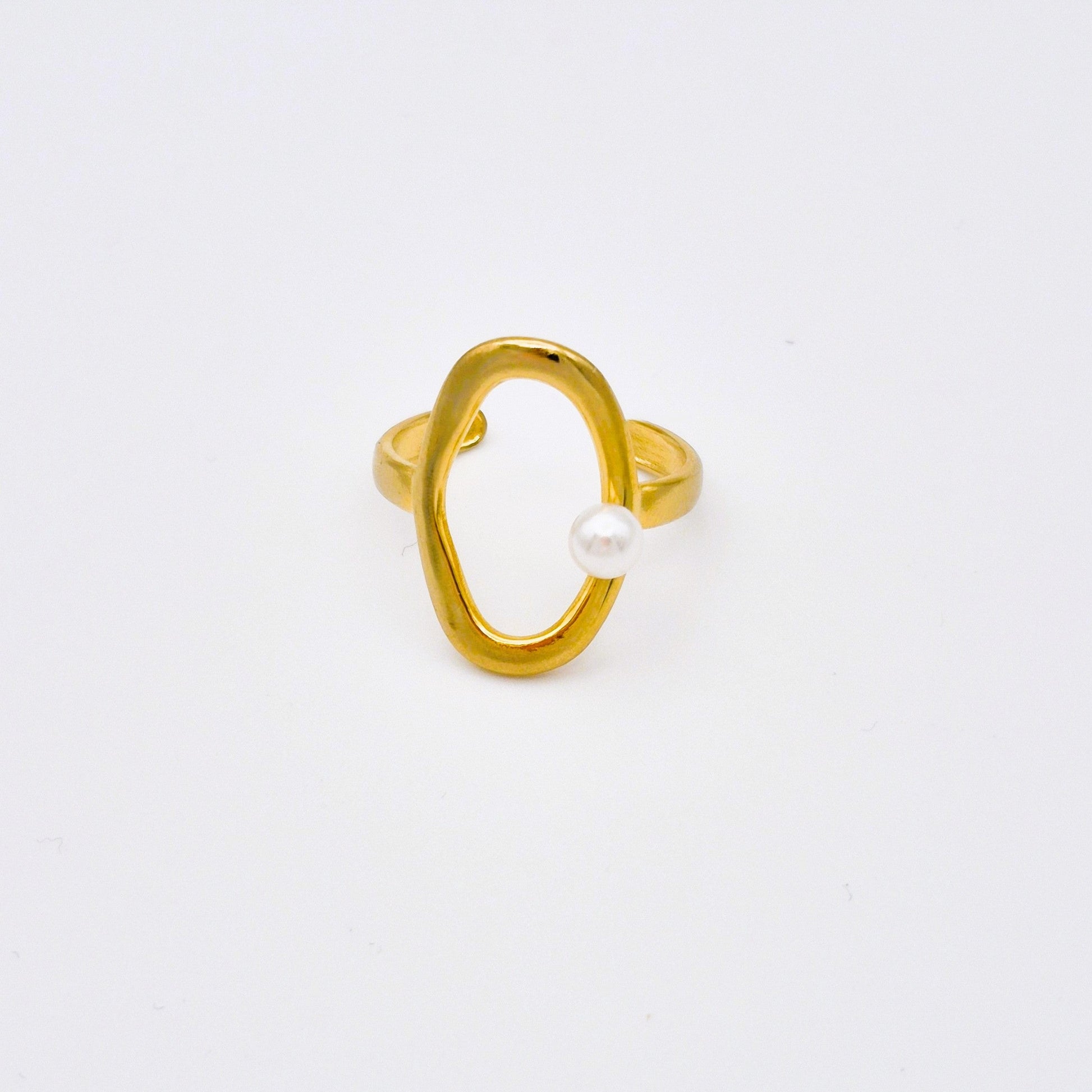 Anillo abierto en tono dorado con diseño ovalado y detalle de perla en un extremo. Una pieza minimalista que representa la libertad, la suavidad y la elegancia.