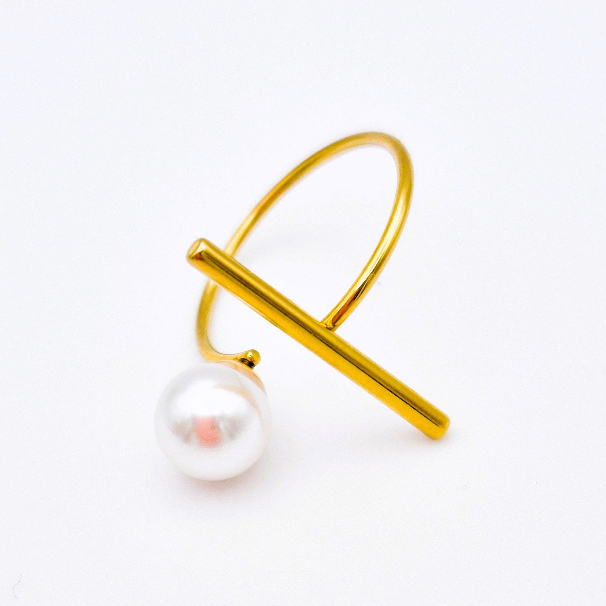 Anillo abierto en tono dorado con diseño de barra recta y perla colgante. Una joya de líneas limpias que combina estructura y suavidad en una sola pieza.