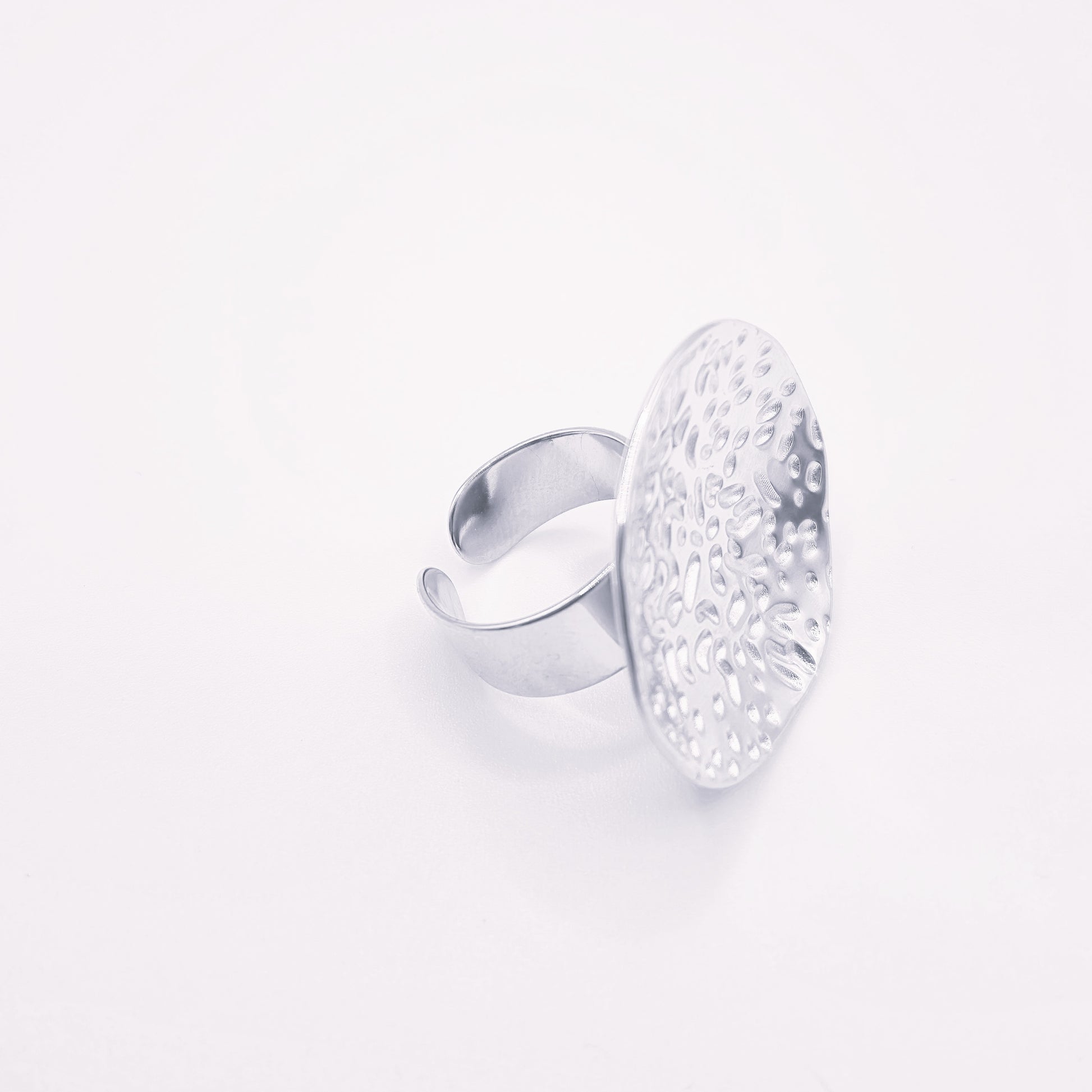 Anillo de acero inoxidable redondo con acabado martillado creando un efecto luminoso. Perfecto para cualquier ocasión.