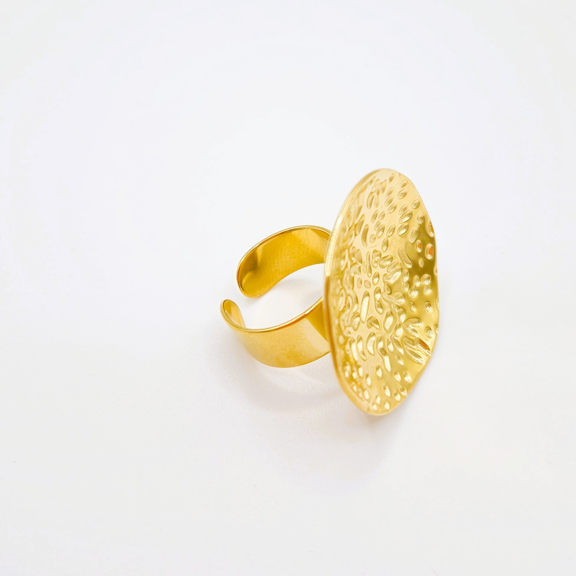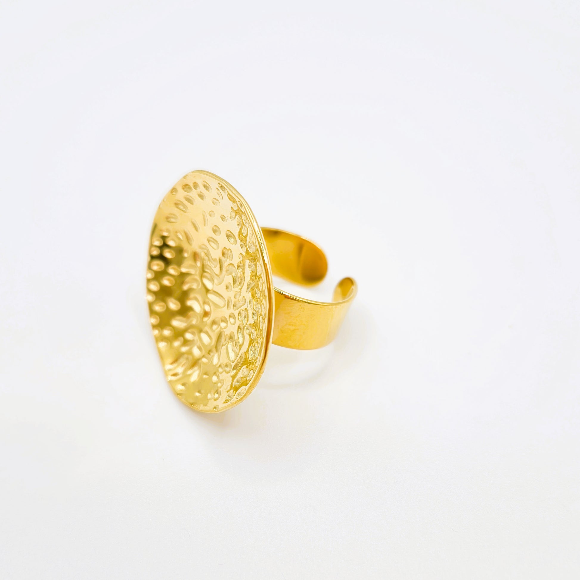 Anillo de acero inoxidable redondo con acabado martillado creando un efecto luminoso. Perfecto para cualquier ocasión.