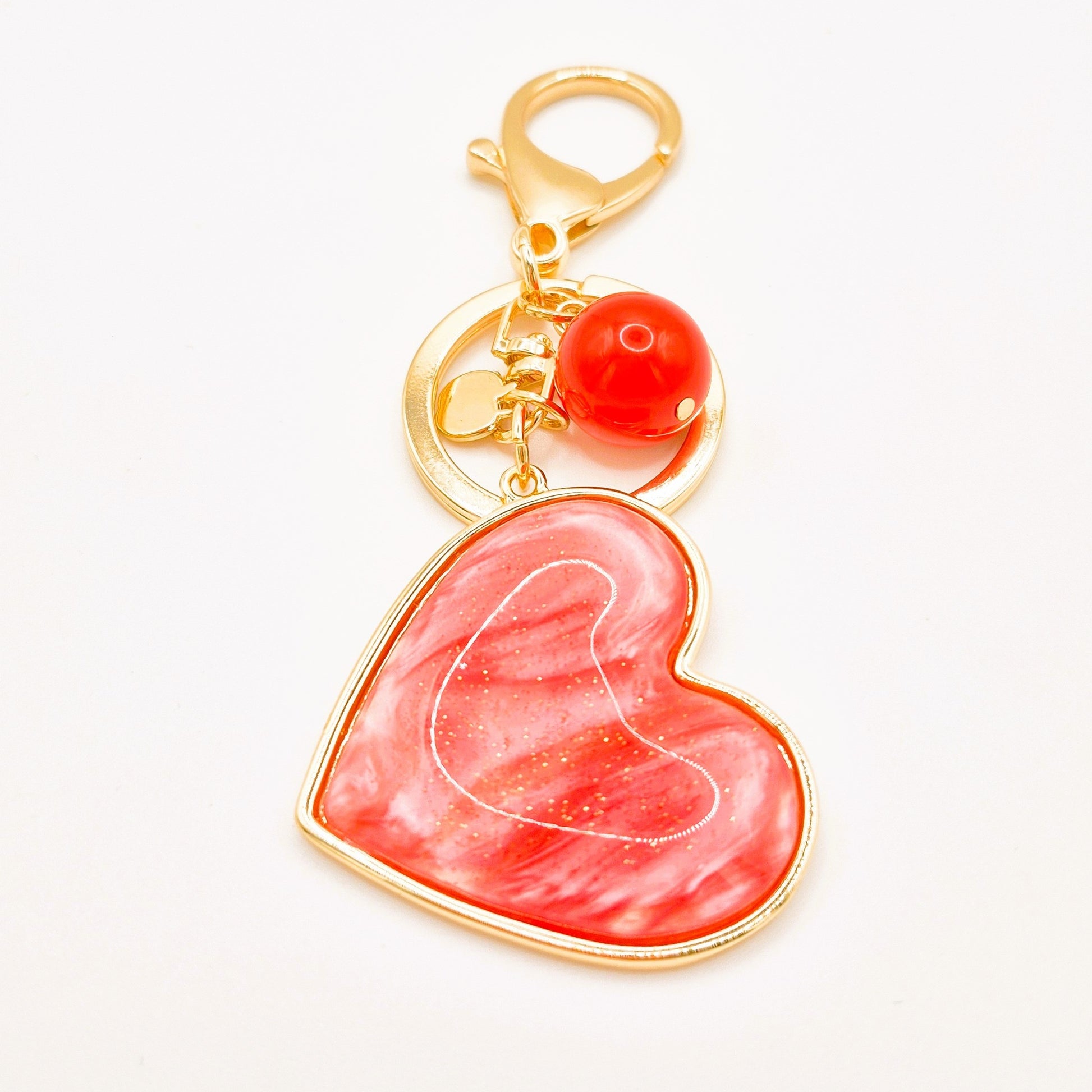 Charm en forma de corazón nacarado enmarcado en dorado, con cierre tipo mosquetón y aro para llaves.