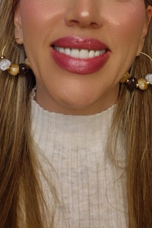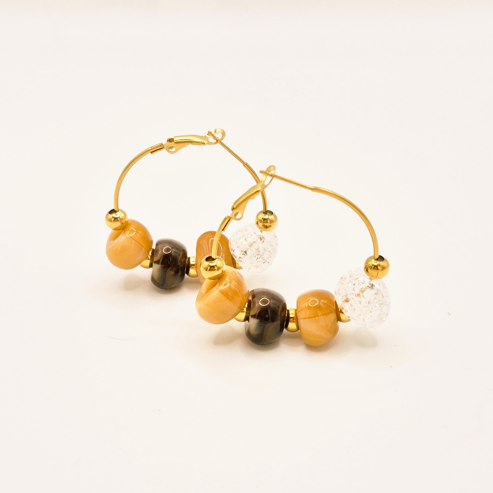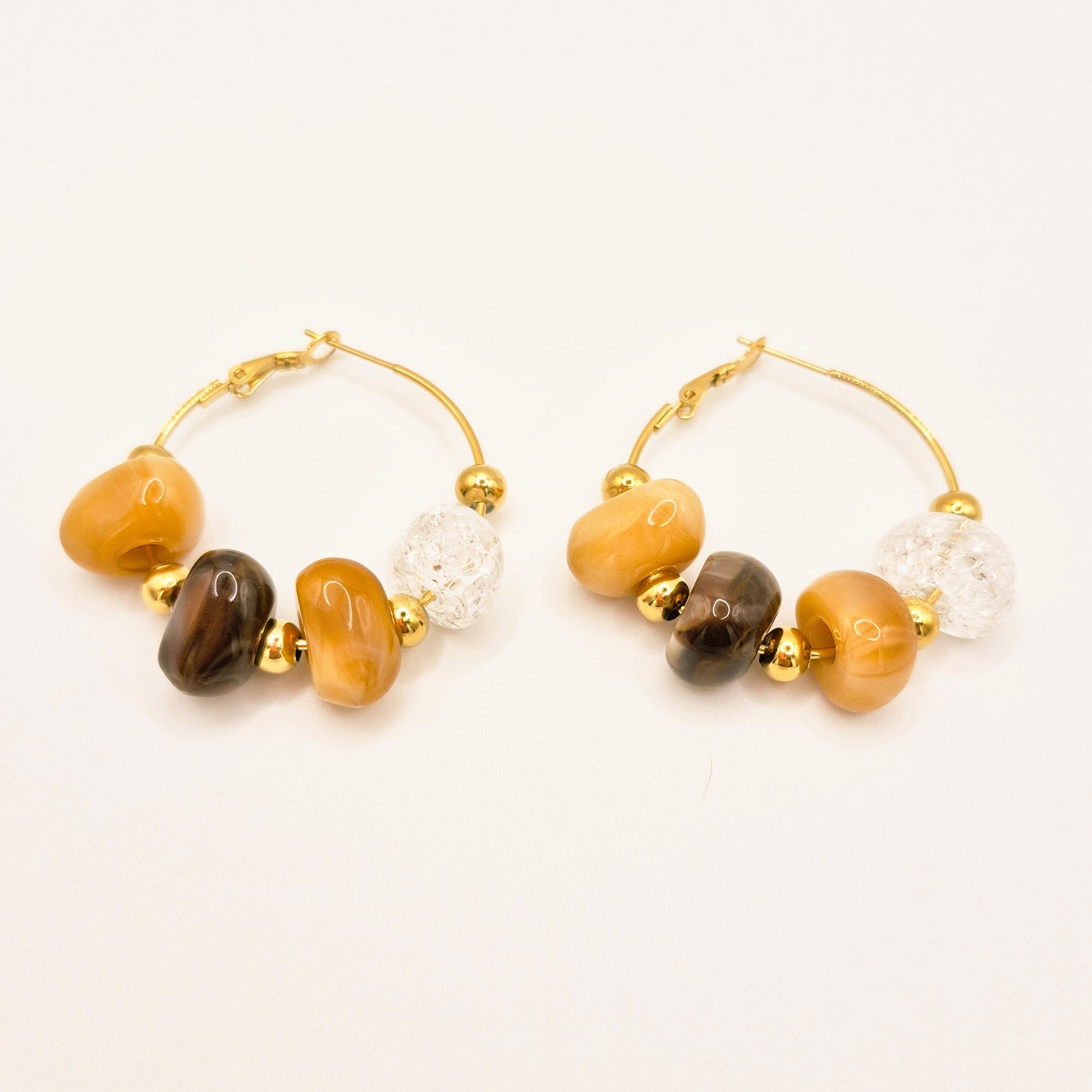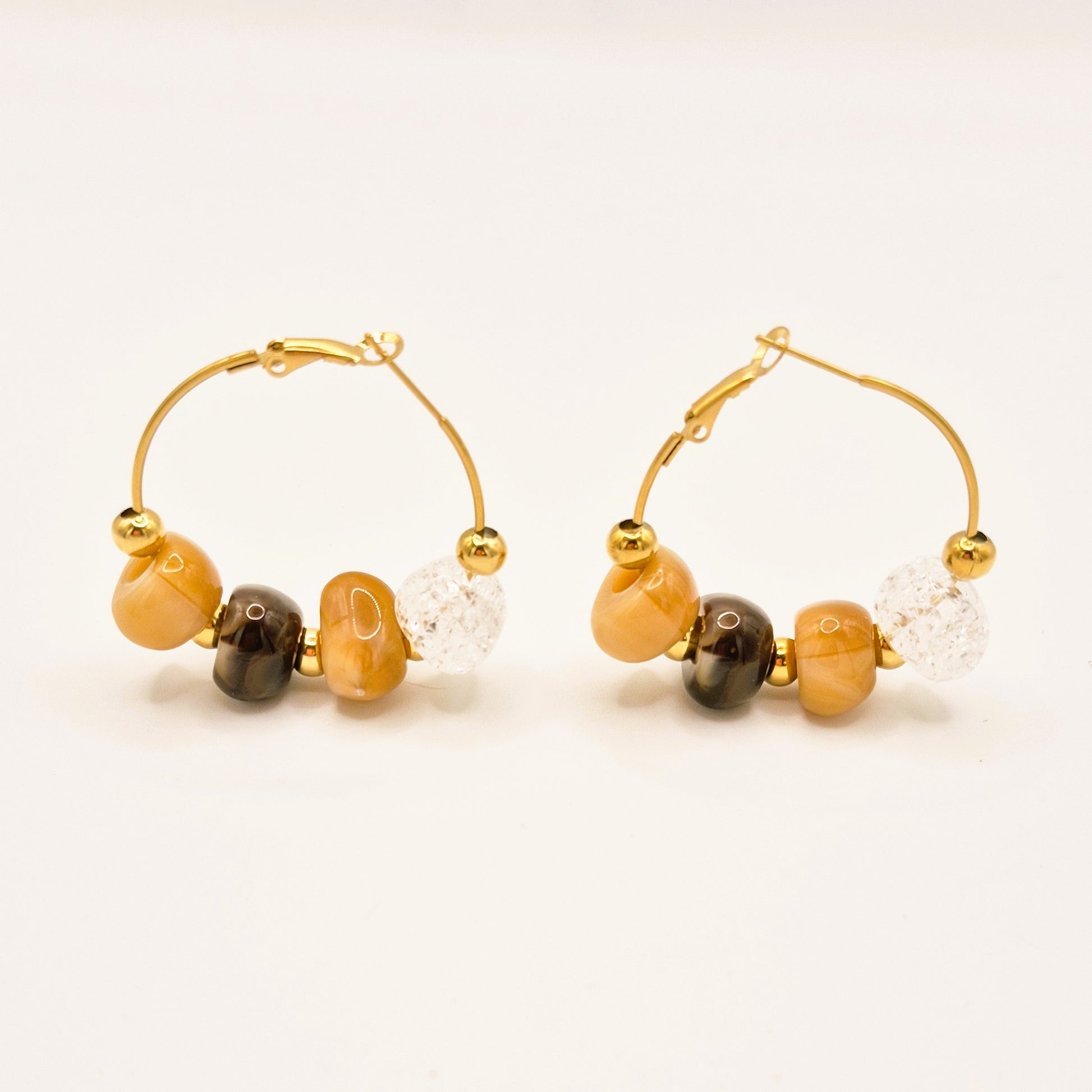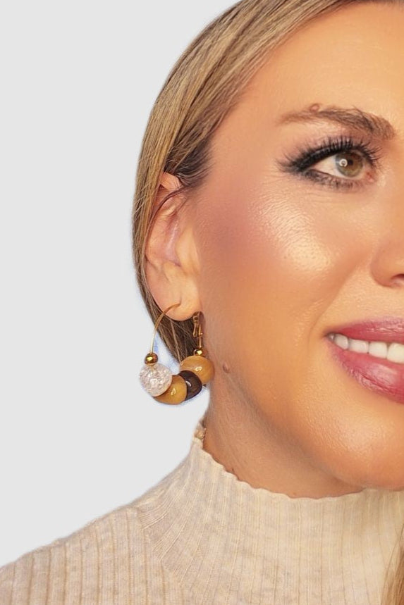 Pendientes en aro dorado con cuentas en tonos ámbar, marrón y una pieza transparente efecto cristal. Su diseño combina calidez y luz, creando un estilo elegante y moderno que aporta personalidad a cualquier look.