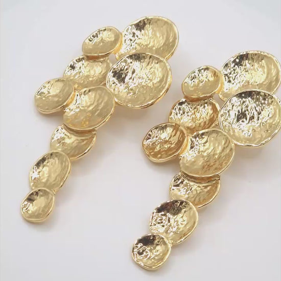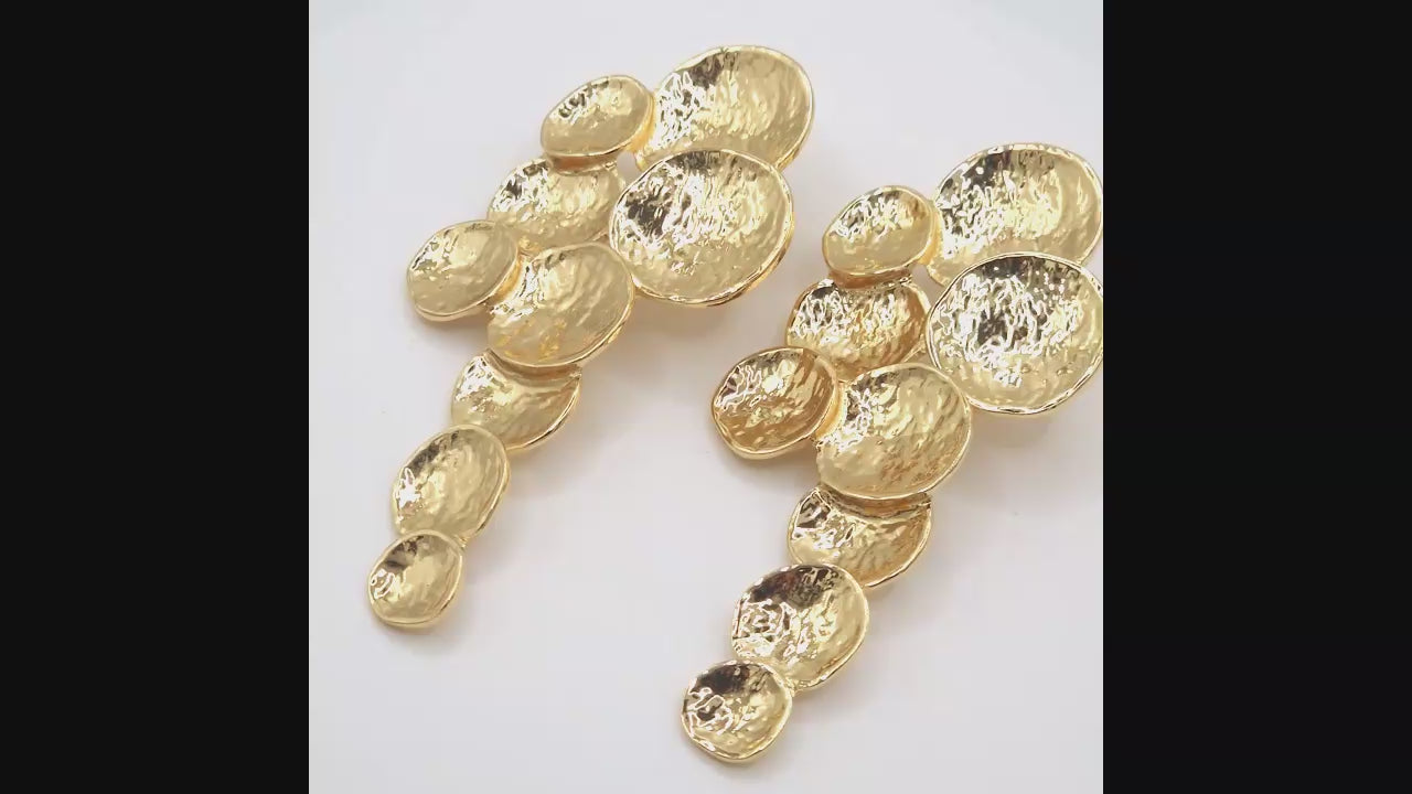Sumérgete en la elegancia del sur con nuestros pendientes Alhambra. Su diseño en cascada, formado por piezas doradas martilladas, crea un juego de luz y movimiento que no pasa desapercibido.