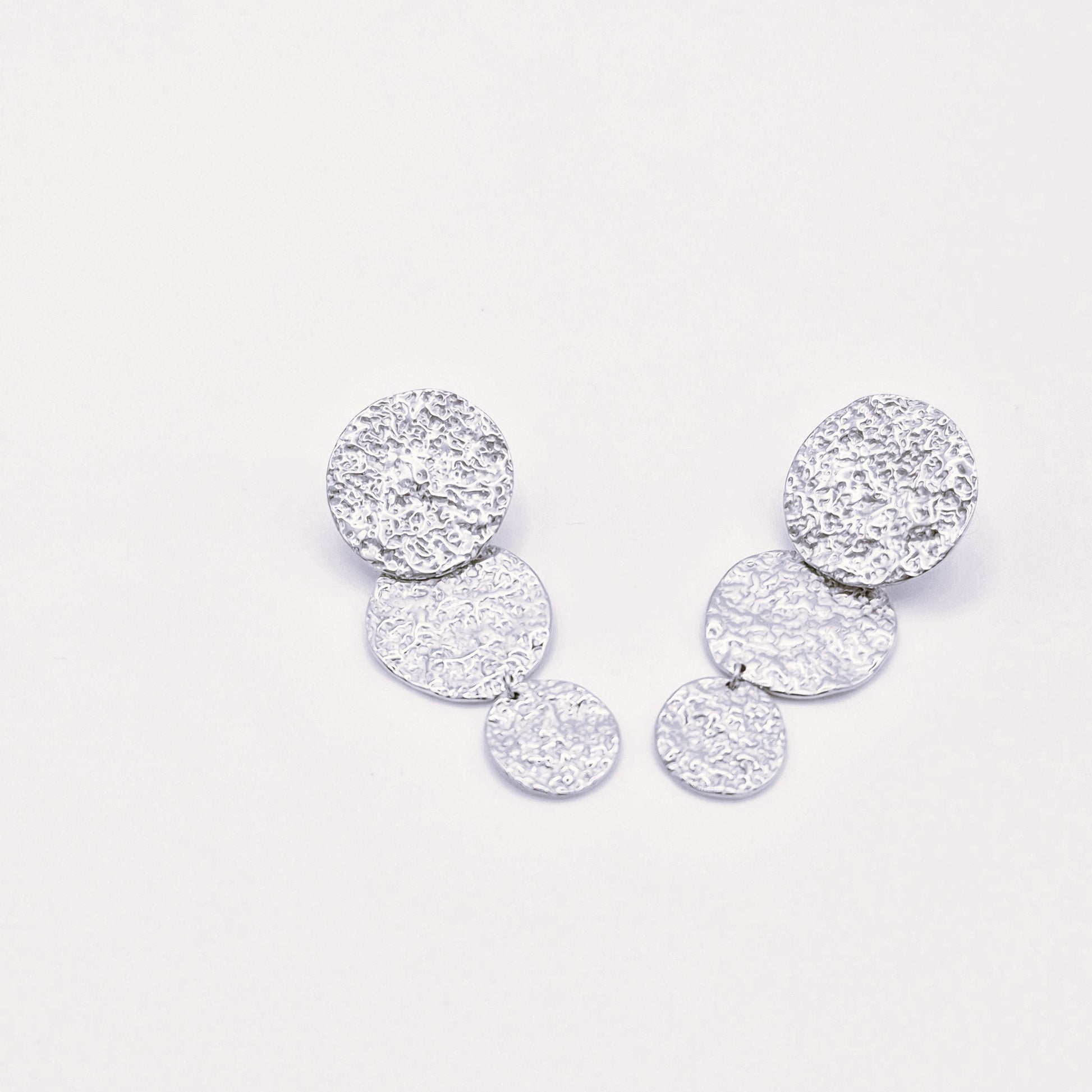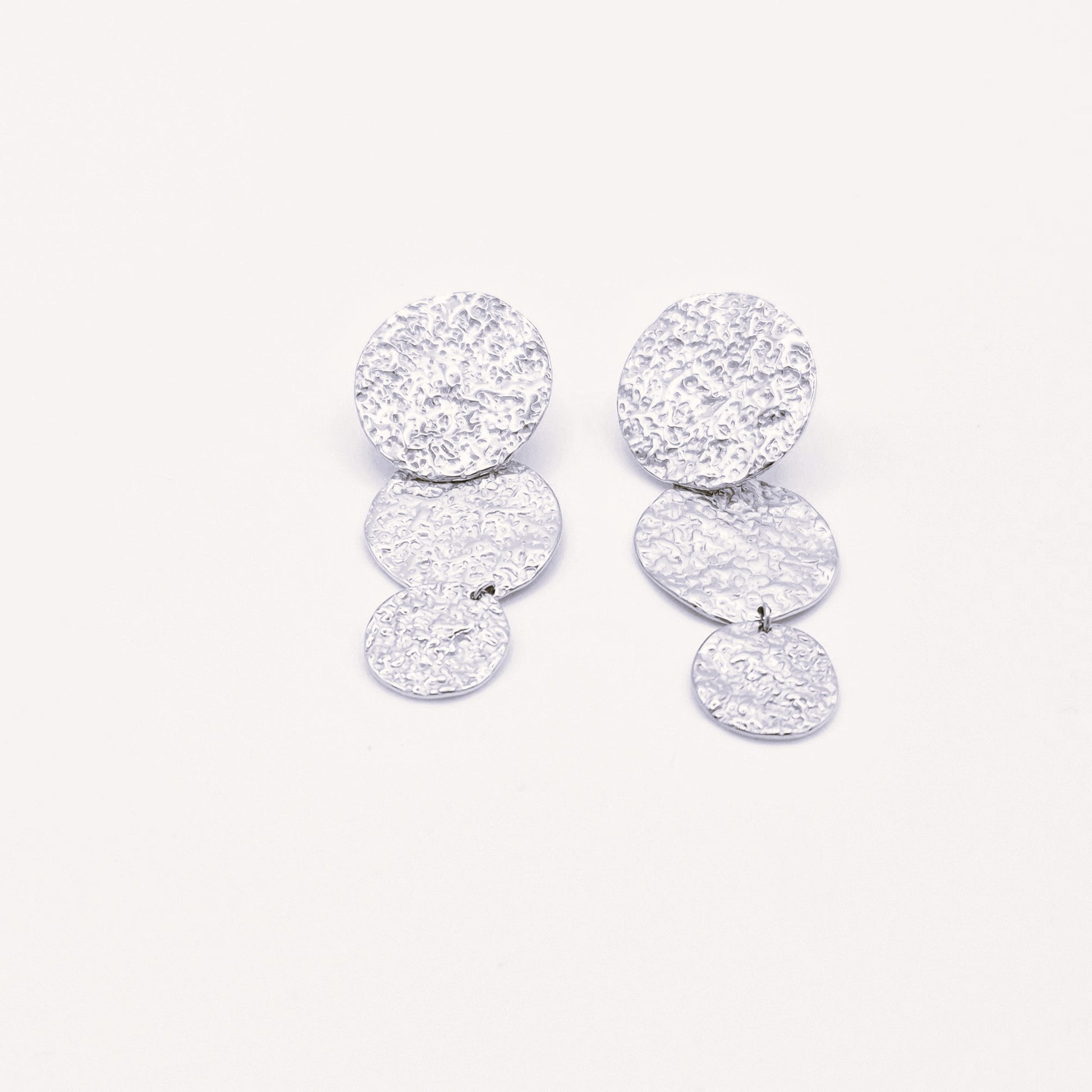 Pendientes de acero inoxidable con diseño de tres círculos martillados en cascada. Su textura irregular capta la luz de forma única, creando un estilo elegante y sofisticado. Ideales para dar un toque de personalidad a tus looks de día o de noche.