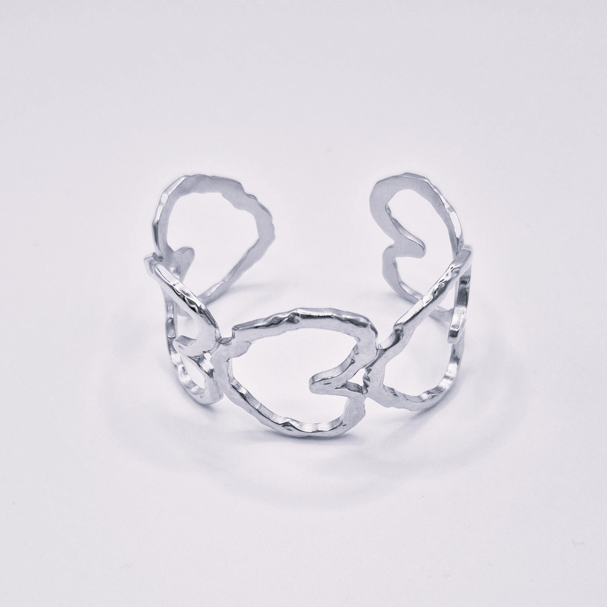 Brazalete abierto de acero inoxidable con textura martelé y acabado plata brillante.