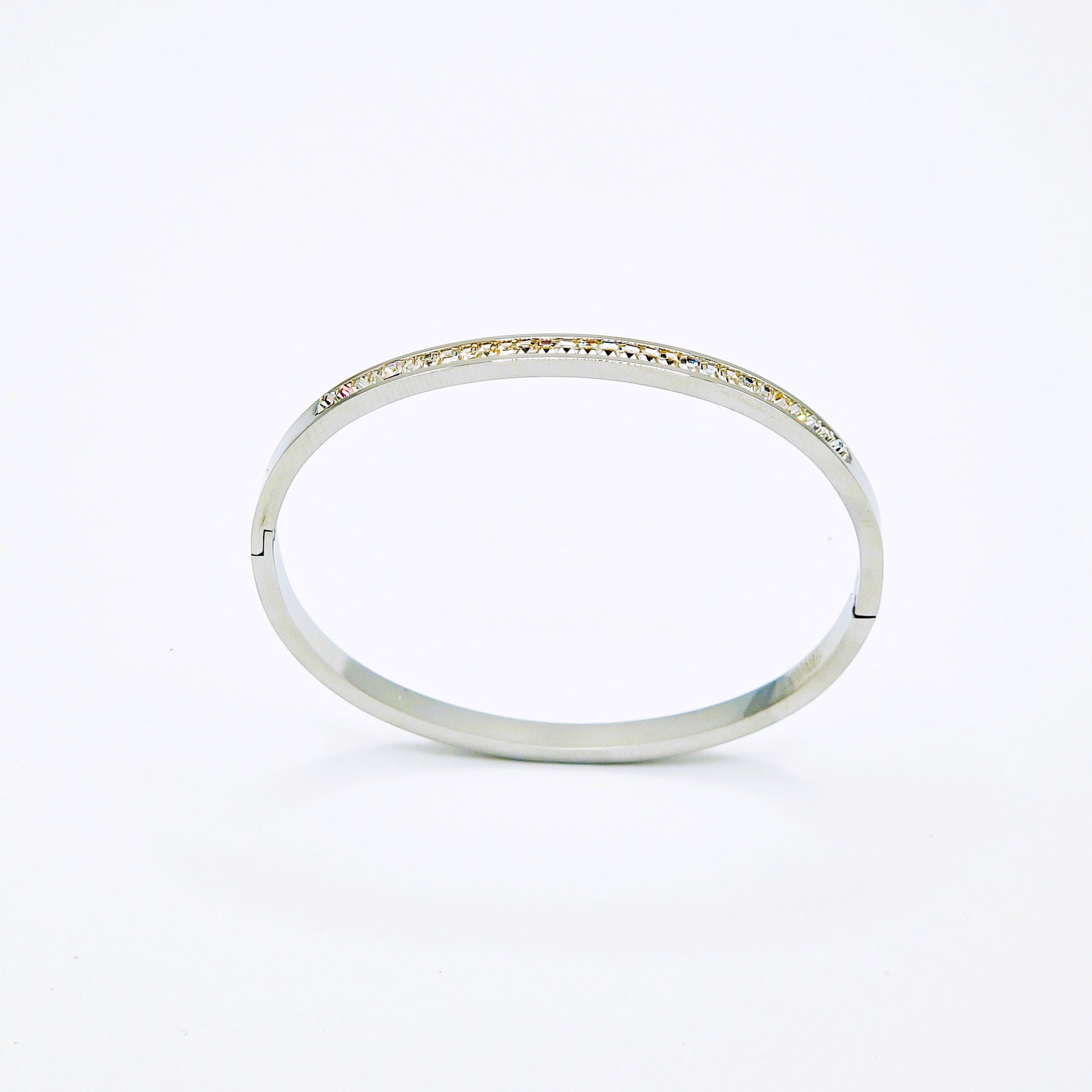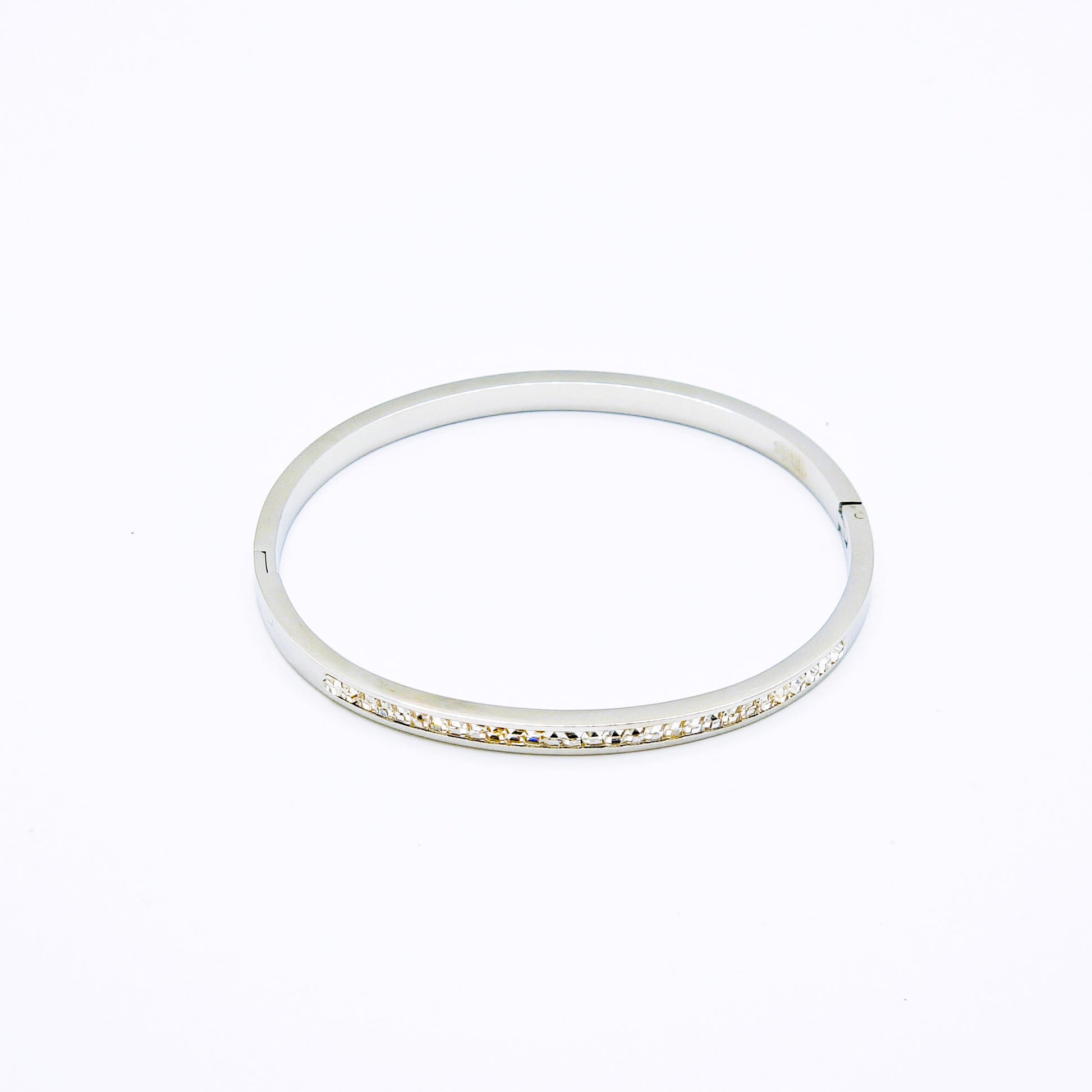 Minimalista y sofisticada. Esta pulsera rígida en acero inoxidable plateado destaca por su linea central de brillo que capta la luz con cada movimiento. Ideal para llevar sola o combinar con otras piezas.